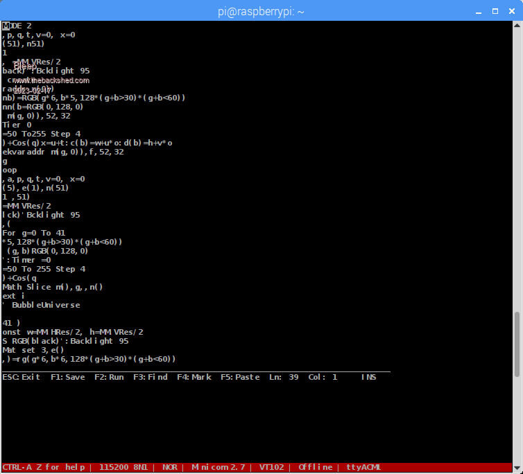 Also, I accidentally copied and pasted all of this piece of code, using autosave. vgabubble.bas.zip I realise it's several slightly different versions of the same code, however once loaded the editor mangles it, the first 35 lines of code are fine and consist of a loop so the rest is never executed. However I didn't think the remainder should get corrupted like this, even though it shouldn't be there? the image is after scrolling down one page. I had done a flash erase and fresh install of b19 with no options set this is a terminal, but the VGA looks the same. This isn't particularly important as I shouldn't have done it! :-( ![]() Any Ideas? Regards, Kevin. Edited 2023-02-17 06:08 by Bleep |