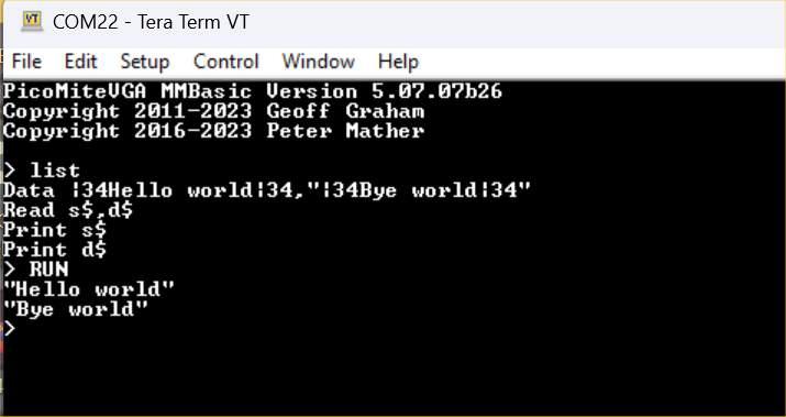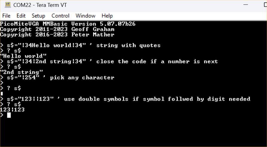 One thing that originally attracted me to MMBasic in the first place was its portability. some way to have "escaped data" (maybe even the cpp exposed) would be nice but I can't help feeling consistency should be paramount. That said, the PicoMite has already gone its own way on a lot of things, so who cares. |