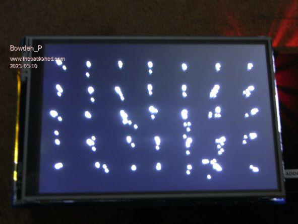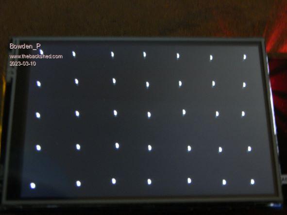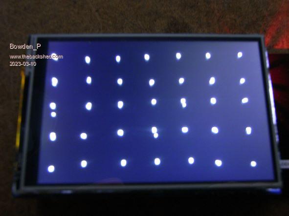 Hi, I have 2 standard PicoMites connected to these screens with :- > option list PicoMite MMBasic Version 5.07.07b24 OPTION SYSTEM SPI GP10,GP11,GP12 OPTION SYSTEM I2C GP20,GP21 OPTION COLOURCODE ON OPTION CPUSPEED (KHz) 130000 OPTION LCDPANEL ILI9488W, RLANDSCAPE,GP8,GP15,GP9,GP13 OPTION GUI CONTROLS 1 OPTION TOUCH GP16,GP17 GUI CALIBRATE 0, 233, 3882, 1275, -866 OPTION SDCARD GP22, GP5, GP18, GP19 OPTION RTC AUTO ENABLE > Both exhibit screen splatter when the "GUI TEST TOUCH" test is run. This is a typical result when making a 7 x 5 array of touched points :- Most - but not all - of the rogue pixels appear on the touch release. Repeating "GUI CALIBRATE" doesn't appear to change this. If I run this code :- ' Touch screen test. ' ================= ' Provides 3 x 3 pixel plots under the touch point. OPTION EXPLICIT OPTION DEFAULT NONE dim x%,y%,i%,j% 'SETPIN GP17, INTL, Touch_Int ' Use this if "OPTION GUI Controls" is zero. gui interrupt Touch_Int cls DO : LOOP SUB Touch_Int x%=TOUCH(X):y%=TOUCH(Y) for i%=-1 to 1 for j%=-1 to 1 pixel x%+i%,y%+j% next j% next i% END SUB I get this result :- Just wondering if my screens are at fault. Has anyone else seen this ? With best regards, Paul. p.s. Sorry about the picture quality. Nothing so constant as change. |