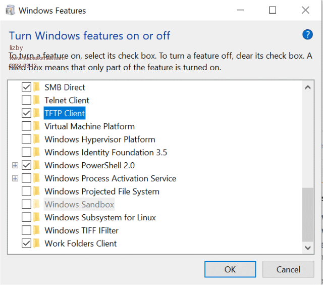 Thanks for that. I struggled with the installation of the SolarWinds TFTP server. It ran through most of the steps, then said the installation had failed. I ran it again, and it asked if I wanted to Repair or Remove. I chose Repair, but TFTP from the PowerShell didn't work. I uninstalled and repeated: again failed, again repaired. Now with Jim's suggestion, after searching for Windows Features, I went here: ![]() Clicked TFTP Client and OK, and now it works. Great improvement in speed of transfer and ease of use. PicoMite, Armmite F4, SensorKits, MMBasic Hardware, Games, etc. on FOTS |