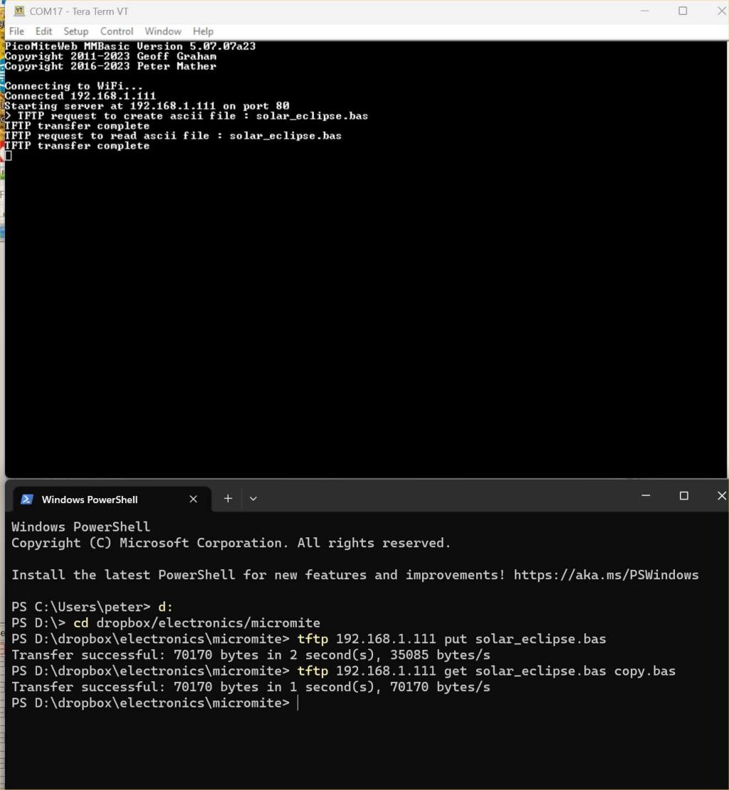 V5.07.07a24 PicoMiteWebV5.07.07a24.zip Note the times taken and the file size See here for how to enable TFTP on windows (tested on W11). Linux users: you are on your own The TFTP server is automatically enabled if you are connected to wifi and makes transferring files easy and fast. NB: The protocol TFTP does not support directory listing etc. so don't ask. It is also completely insecure so only use on your local network. ![]() |