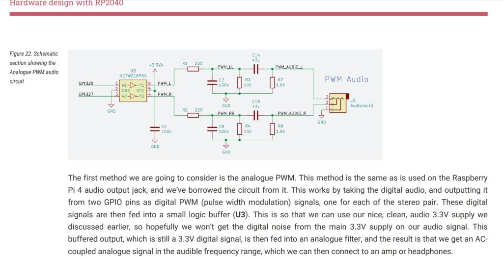 @Eejit, It is very friendly of you to help us find a solution for Tom, but not every pi is the same pi. The Pi4 uses PWM output at 192kHz. If you want 20Hz...20kHz, the Pi4 has to reject 192kHz (around 10x the highest frequency 20kHz). That can be done with simple RC filter as shown in above schematics. The PicoMite runs PWM at 44kHz (2.2x the highest frequency). Using the Pi4 audio filter will not reject much of the 44kHz PWM frequency. You need a better filter. It does not harm trying, but you will end up with a lot of 44kHz (inaudible that is) and digital amplifiers (class D) will distort heavily, and cats will avoid your picomite.... Volhout PicomiteVGA PETSCII ROBOTS |