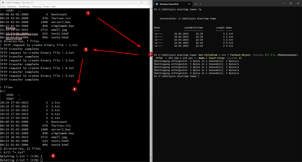 PicoMite MMBasic Version 5.07.07a29 with TFTP (Trivial File Transfer Protocol) First of all @Peter many many thanks! This version looks very promising and could almost be the first beta. Long term stable, paramaters via POST work again. In between I was a bit sad because of the featuritis and the missing instability. But then came TFTP and that has surprised me then but very positive! Unfortunately tftp which is included in Windows (after enabling it in the features) can't do wildcards. Also not in the CMD. But in the Powershell I then searched the following command together (I'm a beginner in PS!): Get-ChildItem *.txt | ForEach-Object -Process {if (!$_.PSIsContainer) {tftp -i 192.168.1.119 put $_.Name;} Start-Sleep -seconds 1} The parameter -i is important (otherwise e.g. no images will work). With this command e.g. only .TXT or .HTML or also all (*.*) files from the current directory can be transferred to the PicoMite in one go! The pause is important so that the PicoMite can keep up with the requests. ![]() Also the deletion on the PicoMite works with wildcards (e.g. kill "*.txt"). @Peter: Is it possible to pass a -y or -all here? Otherwise you have to confirm each file individually. Since TFTP doesn't know DIR, you can't GET files with wildcards. Cool is also that TFTP works if a basic program (e.g. the simple web server) is executed on the PicoMite. So files can be exchanged or added during operation. But that brings me to the next question @Peter: Please create the possibility for security to enable/disable TFTP from the PicoMite side. Preferably not only as OPTION but also as basic command, then you can activate this in your program for e.g. updates. Thanks! Matthias |