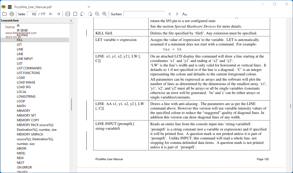 Hello Peter, good to know. I had a look in the manual beforehand. This should be added there. A task for @Geoff?! page 19: KILL fname$ Delete a file in the current directory on the current drive. and see picture: ![]() Nice that you check if TFTP can be enabled/disabled. How will the weather be the next days? ;-) By the way, are you planning a version of PicoMiteWeb with VGA? That would open up a lot of new possibilities! :-) Would this be possible at all? @Jim: You are right when you are alone in your own WLAN. But with three kids and friends the world looks different. And I think the PicoMiteWeb deserves to be used in cool projects. I'm thinking about sports club and community. And now, at the latest, it needs a certain level of protection. Matthias |