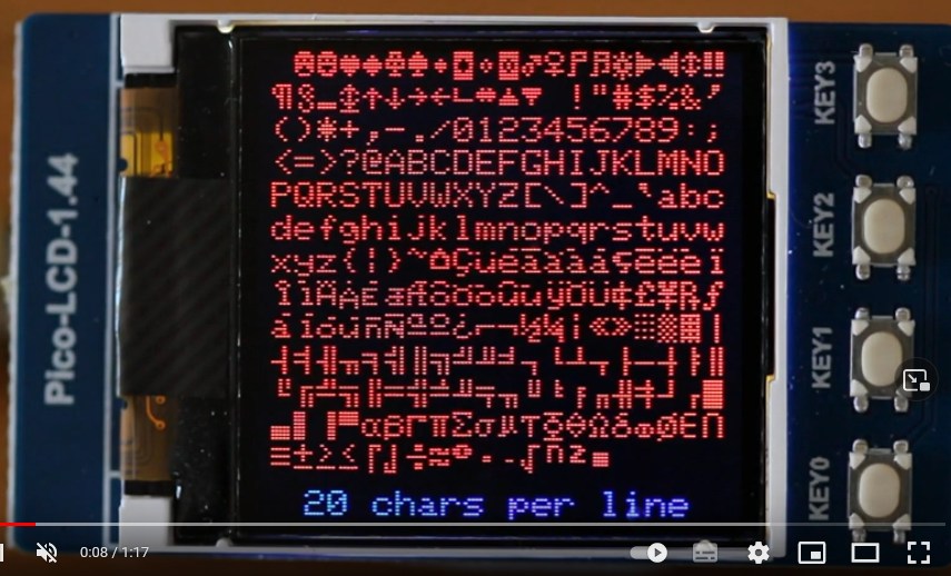 Thanks. I had this working for one character at a time using Chr$(xxx), but am puzzled as to how I can create larger graphics using the extended character set. Tony Goodhew from the UK has posted a Youtube video showing a text and graphics workout for the Waveshare 1.44 LCD running uPython on a RPi Pico: ![]() I'm trying to find out how to do the same in MMBasic, but I haven't used basic since the early eighties. Fnd finding the Picomite project a few weeks ago has rekindled my interest. I am using Tera Term VT on Win 11 to code my Picomite, and the embedded fonts folder in my PicoMite firmware download contained extra fonts, but no additional information. Tony Goodhew's interesting video is here Franzi |