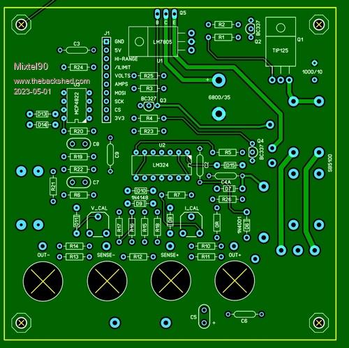 You can be the guinea pig and build one if you like, Daniel. :) As Volhout said though, no guarantees about stability. You almost always need to tweak them. I've just done a couple of mods. If all the components are mounted on the front of the analogue PCB then you can use 50mm spacers to join it tp the front one, and wire links or something for J2. You can also put Q5 standing up at the back of the board with a small heatsink. This arrangement should be ok for experimentation up to 100mA or so, just to iron out early problems. The holes below the display take standard terminals. Edited 2023-05-01 07:14 by Mixtel90 Mick Zilog Inside! nascom.info for Nascom & Gemini Preliminary MMBasic docs & my PCB designs |