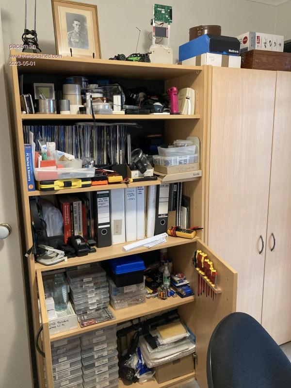 Hmmm...OK time for me to come clean, but honestly looking at some of you I've decided my mess is modest. My wife does not agree and I'm often threatened with an arbitrary (while I'm not there) cleanup! Nooo... Mick, I reckon you win and Peter you get the Spock award (most purposeful - note the blue cloth for wiping sweat off the brow)! Geoff would have to be Luc Picard - even looks like him a bit :) ![]() Not sure what happened to the colours - I rotated it with Gimp. ![]() ![]() The other big cupboard is chocka, as are the two filing cabinets. The biggest problem I reckon is cables, they take up so much room but you never have the one you want if you get rid of any. I'd love a couple of nice shelves like some of you professionals have but I've been threatened with divorce if I try! Greg |