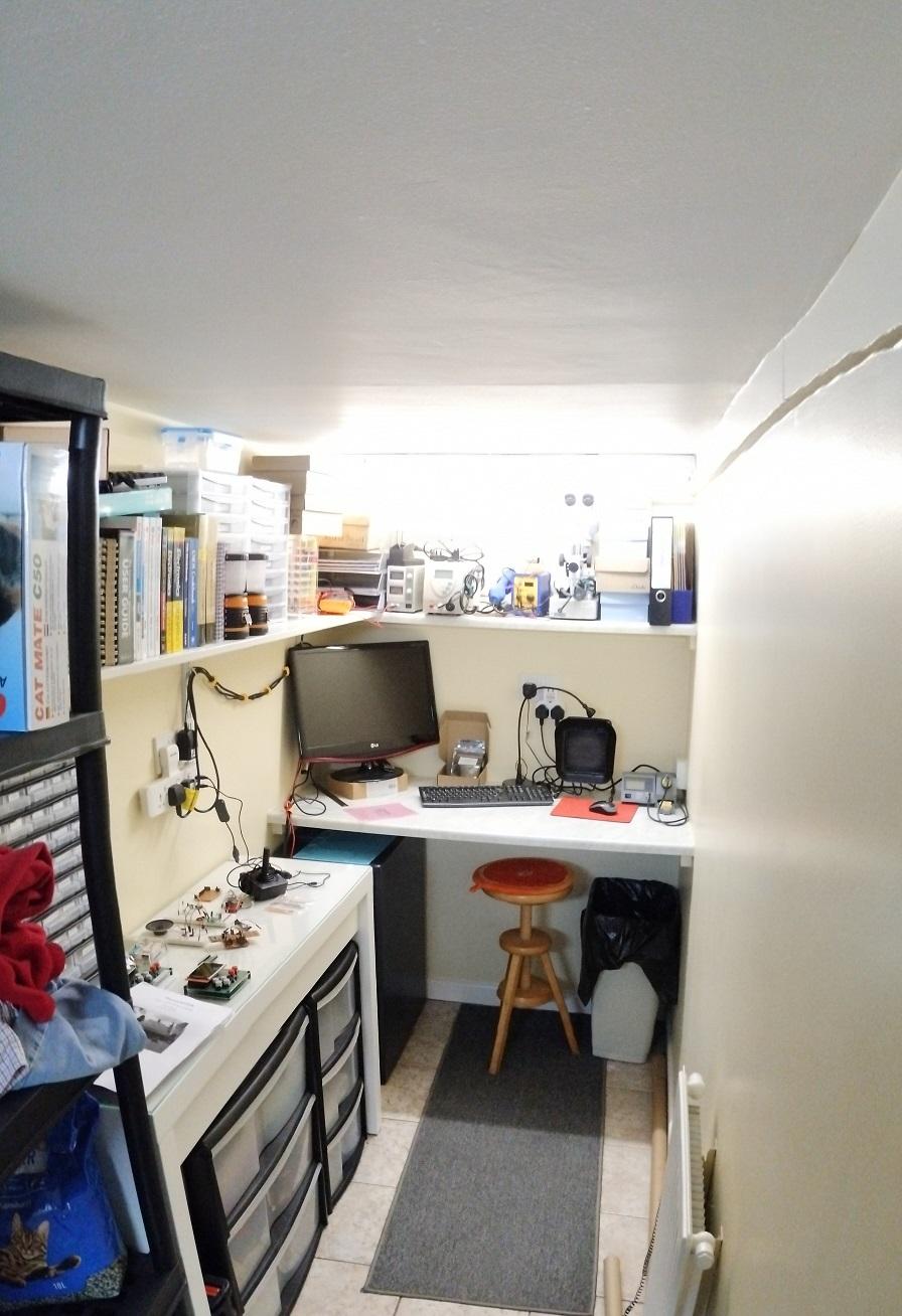 I'm not sure what "tidy" means. I have "stuff" distributed in various places, with the majority being in the shed. That has very little workspace though and is mainly used for mechanical stuff. I have various boxes of components in the other room on some racking and some partially buried close to where I sit in the living room. Most of the resistors are stored in their bags in a business card folder and two plastic boxes that cakes came in. My "work area" is just a little bigger than the bit of table that's left clear when I move the keyboard out of the way! Test gear is balanced wherever it will fit at the time. :) I sometimes *dream* of having a "proper" work area ... Mick Zilog Inside! nascom.info for Nascom & Gemini Preliminary MMBasic docs & my PCB designs |