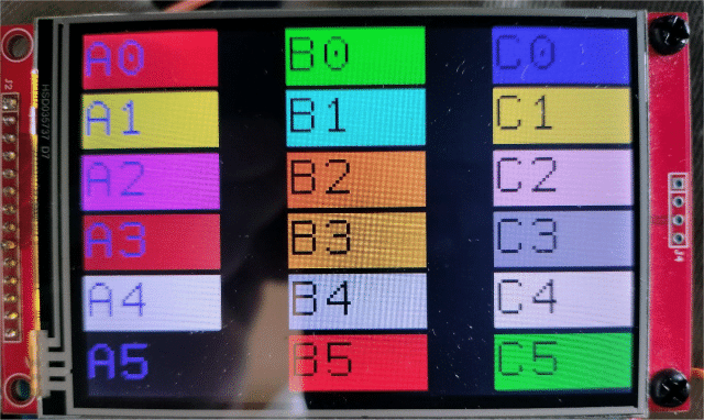 I like to lay things out in rows and columns (of varying widths) and then position items as fractions of mm.vres and mm.hres. For instance, with six equal rows and one column starting at zero, another centered at mm.hres/2, and a third right justified at mm.hres-1, the following code would produce this: ![]() Dim string ch Dim integer i,j,k,fnt,iRows=6,iCols=3 Dim integer b%(15)=(RGB(red), RGB(green), RGB(blue),0,0,0,0,0,0,0,0,0,0,0,0,0) b%(3)=RGB(Yellow): b%(4)=RGB(cyan) b%(5)=RGB(gold): b%(6)=RGB(magenta): b%(7)=RGB(brown): b%(8)=RGB(pink) b%(9)=RGB(salmon): b%(10)=RGB(orange):b%(11)=RGB(grey):b%(12)=RGB(white) b%(13)=RGB(lightgrey): b%(14)=RGB(beige): b%(15)=0 ' black fnt=4 ch="A" CLS For i=0 To iRows-1 Text 0,i*(MM.VRes/6),ch+Str$(i)+" ",,fnt,3,b%(2),b%(j Mod 16) Inc j Text MM.HRes/2,i*(MM.VRes/6),Chr$(Asc(ch)+1)+Str$(i)+" ",C,fnt,3,0,b%(j Mod 16) Inc j Text MM.HRes-1,i*(MM.VRes/6),Chr$(Asc(ch)+2)+Str$(i)+" ",R,fnt,3,0,b%(j Mod 16) Inc j Next i This is on an ILI9488 with 480x320 resolution, but should work on an ILI9341 with 320x240 (maybe with change of scaling) or VGA or MMB4W. Or like this: ![]() ~ Edited 2023-05-12 23:35 by lizby PicoMite, Armmite F4, SensorKits, MMBasic Hardware, Games, etc. on FOTS |