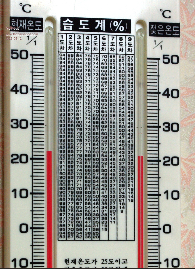 Looked at Wiki, found a picture that shows a physical device. My chineese is sub zero, but I think that the tables columns indicate the temperature difference and a certain level of the dry bulb (the wet bulb would normally not exceed 35C since humans would die, and there would be no-one to read the temperature). ![]() This would require pretty accurate temperature measurement and calibration. I'll play a bit with the idea. The good thing is that the wet bulb is easy to achieve since there are water pools in the habitat... Volhout Edited 2023-05-12 21:13 by Volhout PicomiteVGA PETSCII ROBOTS |