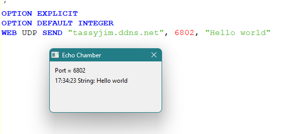 I have now put a WEBmite on the net. It is running a slightly modified version of Peters example. ' OPTION EXPLICIT OPTION DEFAULT INTEGER DIM remoteIP$, n, lastTime$ WEB UDP INTERRUPT myUDPint 'WEB UDP SEND "tassyjim.ddns.net", 6802, "Hello world" DO LOOP UNTIL n > 100 SUB myUDPint PRINT "received "+MM.MESSAGE$+" from "+MM.ADDRESS$+" at "+TIME$ IF remoteIP$ = MM.ADDRESS$ AND LEFT$(lasttime$,5) = LEFT$(TIME$,5) THEN INC n ELSE remoteIP$ = MM.ADDRESS$ lastTime$ = TIME$ n = 1 ENDIF IF n < 10 AND LEN(MM.MESSAGE$) < 200 THEN WEB UDP SEND MM.ADDRESS$,6802,MM.MESSAGE$+" at "+TIME$ ENDIF END SUB The biggest risk with having a simple server on the net is how easy it would be to end up with a race condition where a message gets bounced back and forth eating up all your bandwidth and eventually getting banned by your ISP. The above code should limit a user to 10 hits in any minute. Not very sophisticated and I will do more but it would be silly announcing the code. That would make it too easy for anyone wanting to play silly games. Code at the other end is: ' OPTION EXPLICIT OPTION DEFAULT INTEGER WEB UDP INTERRUPT myUDPint WEB UDP SEND "tassyjim.ddns.net", 6802, "Hello world" DO LOOP SUB myUDPint PRINT "received "+MM.MESSAGE$+" from "+MM.ADDRESS$+" at "+TIME$ END SUB It just sends one packet and prints the reply. This will test your router to see if it has port triggering or port forwarding set up. Jim VK7JH MMedit |