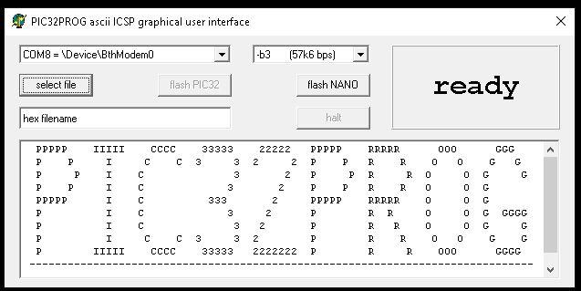 double-click on "P32P GUI.exe" to launch the program. select the comm port that the nano is attached to from the dropdown menu, then click on the 'flsh NANO' button. all going well, the 'ascii icsp' firmware should be uploaded to the nano (ensure that there is no jumper on the nano's RESET pin).