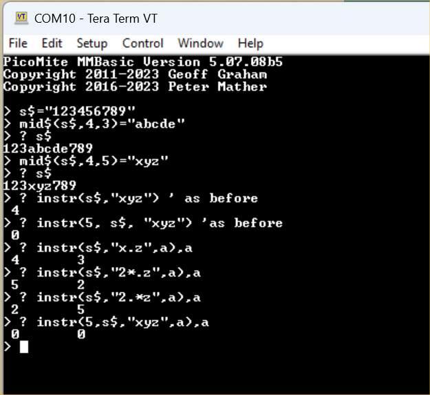 V5.07.08b5 https://geoffg.net/Downloads/picomite/PicoMite_Beta.zip Changes to WebMite as per this thread Other new functionality. The MID$ command can now insert a string that is a different length than the selected section Full, optional implementation of regular expressions in INSTR and LINSTR INSTR([start],text$, search$ [,size]) LINSTR(text%(),search$ [,start] [,size] In both cases specifying the size parameter causes the firmware to interpret the search string as a regular expression. The size parameter is a floating point variable that is used by the firmware to return the size of a matching string. If the variable doesn't exist it is created. e.g. ![]() Other changes: Fixed bug in MM.INFO(OPTION ANGLE) returns an incorrect value Fixed minor bugs in CALL and MM.CMDLINE$. LOAD SPRITE no longer requires exact spacing of the width,number,height fields. Fixed issue where changing volume when PLAY TONE is playing the same on both channels causes one channel to disappear. Fixed bug where EXECUTE command does not work at the command prompt Fixed bug where CLS after NEW when a framebuffer is active can crash system. Fixed bug where using EXECUTE in a program that has been AUTORUN crashes the system. |