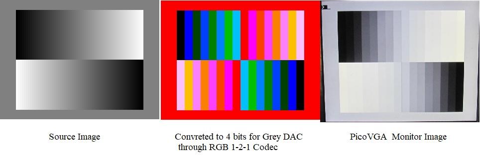 Images must first be processed to convert the colours as the PicoVGA codec expects to output to RGB 1-2-1 hardware. A normal greyscale image will come out B&W on the monitor as black and white are the only grey-scale colours.