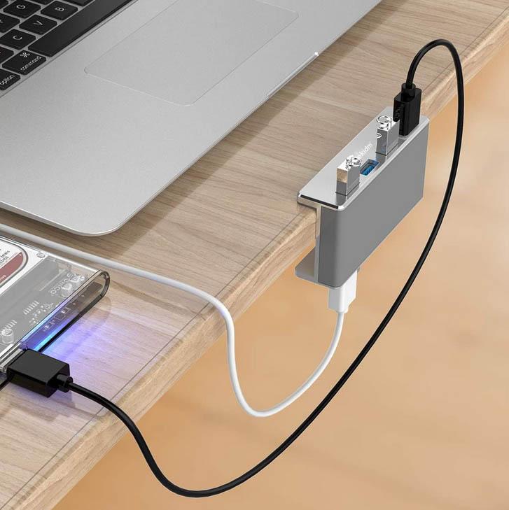 This is fed from the PC's USB3 port via a USB3 A-A cable from the underneath (The white cable) This cable is supplied with the unit and is a USB3 A-A type, it works fine but is a bit short on length.