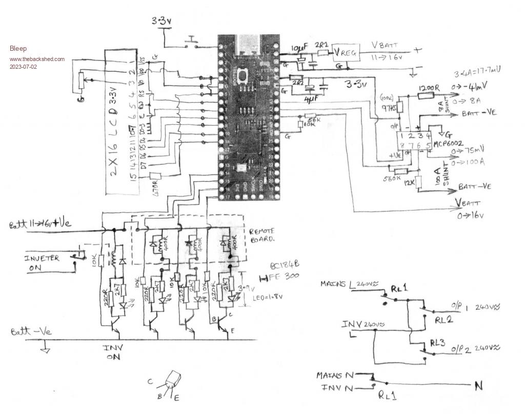 This is very specific to me, in that it allows for Economy 7 use over solar, if available, the inverter can in theory run both fridge and freezer together, it's about 1.2Kw (maybe), however both fridge and freezer take a hefty surge at start up, 50 to 60A from the battery, so my circuit/program sequences the fridge and freezer in turn, to prevent either of them stalling the other during power up, it also powers the inverter on for a couple of seconds before applying the load, again because of a quirk with the inverter that it ramped up it's output voltage, neither fridge or freezer liked this.