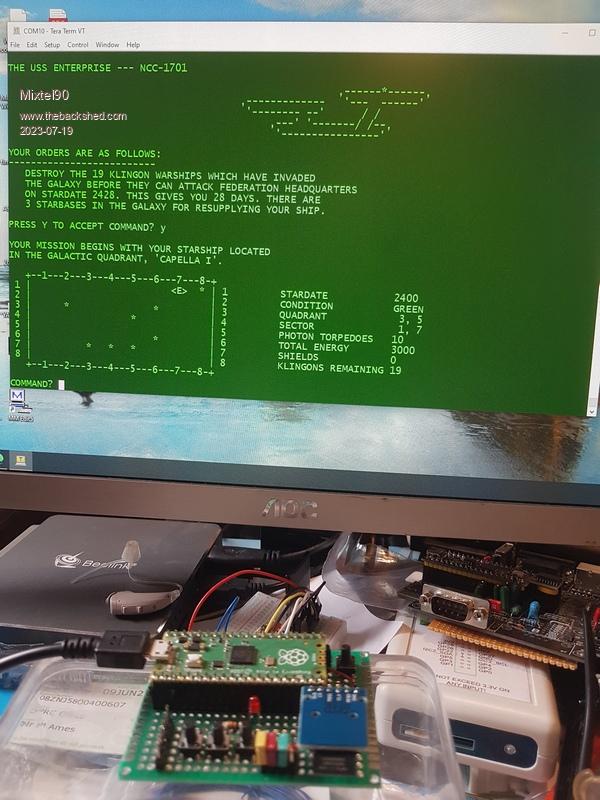 I'm actually part way through converting that game to use in Mode 1 VGA on the PicoMite, with pretty graphics. It's one of "those" projects that gets picked up now and again. There have been versions of it for just about everything. :) Getting text files (e.g. *.BAS) onto the RC2040 is ok, just cut & paste via Tera Term (but file size is limited and you have to use delays in Tera Term). Binaries are more difficult. I've not tested it yet, but there is a DOWNLOAD.COM program on drive A: and Grant Searle did a program to convert binary files into a compatible form to use it. Hopefully I won't need to edit any disk image files as it looks difficult to me. The usual transient commands are provided on drive C: and there are some programs (including Startrek) on drive D:. I know I can save MBASIC programs to drive B: 'cos I've done it. :) A 64GB microSD card gives you drives A: to G:. A 128GB card gives you up to P:. In both cases the last drive is smaller than the others. Very Important! This had me head scratching. When you are creating the microSD card make sure you read the Readme file! I didn't put all the necessary files on it and I was getting errors. Oh, and get the MISO and MOSI connections right way round on your breadboard.... :) Mick Zilog Inside! nascom.info for Nascom & Gemini Preliminary MMBasic docs & my PCB designs |
