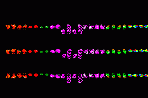 vegipete said  Here's a short program with the sprites converted to CSub form, as used by Picomite(VGA) firmware 5.0708b16 (or newer.) This just displays them on screen. I've created the various required mirror images - Ugg and Wrongway were a bit tricky because they actually need to be mirrored at 45 degrees. Next I need to compress them...