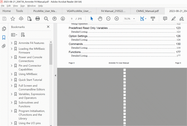 For me, the manual shows perfectly in the Chrome browser, but when I save it and open it with Acrobat, I get the problem palcal describes. I downloaded MatherP's file, and it is the same in Acrobat: ![]() PicoMite, Armmite F4, SensorKits, MMBasic Hardware, Games, etc. on FOTS |