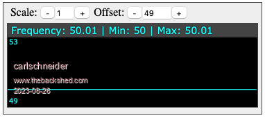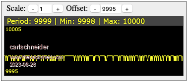Thanks for the feedback @chopperp and TassyJim. I have tried longer gate periods but the result is always an integer value, even printing str$(pin(GPnn),6,4). I have used PULSIN to measure the period and using that to determined the frequency. It measures period in µs. Sub Freq TimeEnd=Timer Period%=Pulsin(GP22,0,25000,25000) Period2%=Pulsin(GP22,0,25000,25000) Period3%=Pulsin(GP22,0,25000,25000) Period%=(Period3%+Period%+Period2%)/3 DeltaTime=TimeEnd-TimeStart Freq!=(1000000/Period%)/2 ' Measuring PWM 50% duty cycle so two edges Frequency$=Str$(Freq!,6,2) ' used in the JSON string to talk to the graph TimeStart=Timer End Sub This subroutine is called by a 1s Tick. Interestingly the DeltaTime is rarely 1000ms, usually under. ![]() Frequency to 2 decimal places. Target frequency for the PWM output I'm measuring is 50.01Hz. ![]() Using the Pin(GPNN),FIN would just have been far more elegant:) Edited 2023-08-26 13:47 by carlschneider Cheers Carl Retirement is tough on Hobbies without a day job |