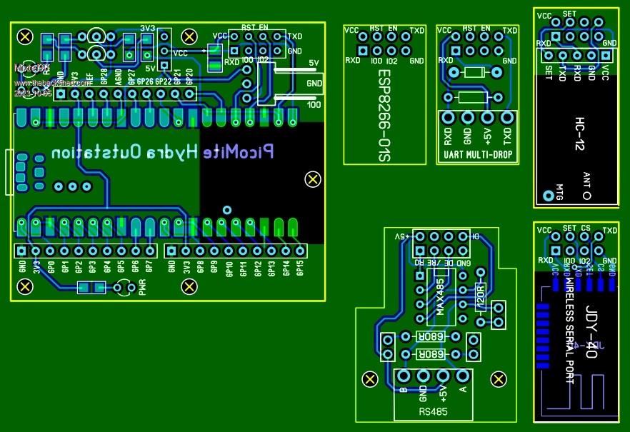 Something to play with on a bit of a boring day. Recently I've done a couple of LCD display adapters with the name "Hydra". They can use an optional serial comm board to control remote IO. This is an extension of the idea, using the same little comm boards fitting the same ESP9266-01S connector. This design is for a remote IO outstation on the end of a serial link, however the type of link is up to the user - the main board is the same. Four PicoMite pins are reserved, all the rest are available. So far the possibilities are: TTL UART single or multidrop. RS-485 simplex. ESP2866-01S HC12 JDY-40 If there is sensible space then anything using RXD, TXD and a couple of other pins could be used. Power is via either the PicoMite's USB or a 3-pin JYK connector. The third pin on this is connected to the IO0 pin of a ESP8266, if one is used, so that a link to GND can be easily installed for flashing it. A couple of design points. The PicoMite is SMD to get the best distance from any antenna. That end of the PicoMite only contains leads to IO pins so hopefully there will minimal RF problems. If there are then a long-pin socket can be used for the comm module. Having the PicoMite in the way probably makes removing the ground plane areas a bit pointless. :) Mick Zilog Inside! nascom.info for Nascom & Gemini Preliminary MMBasic docs & my PCB designs |