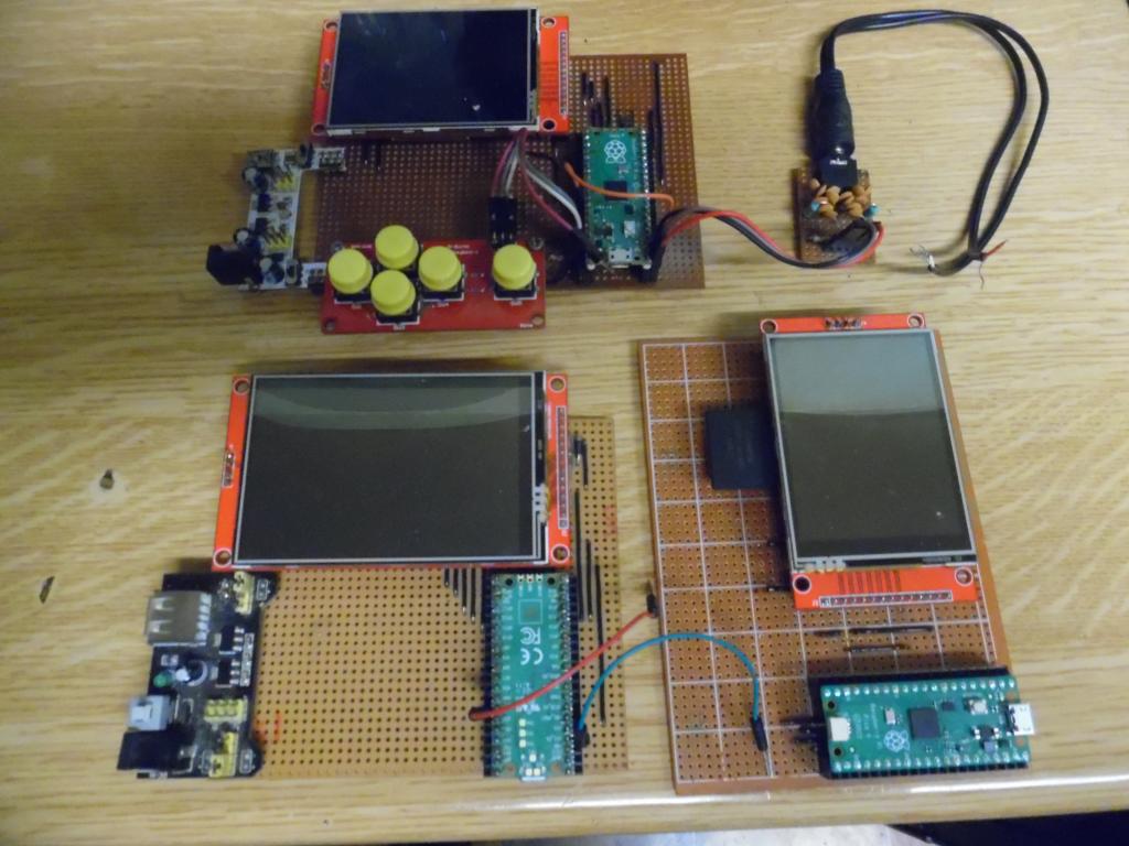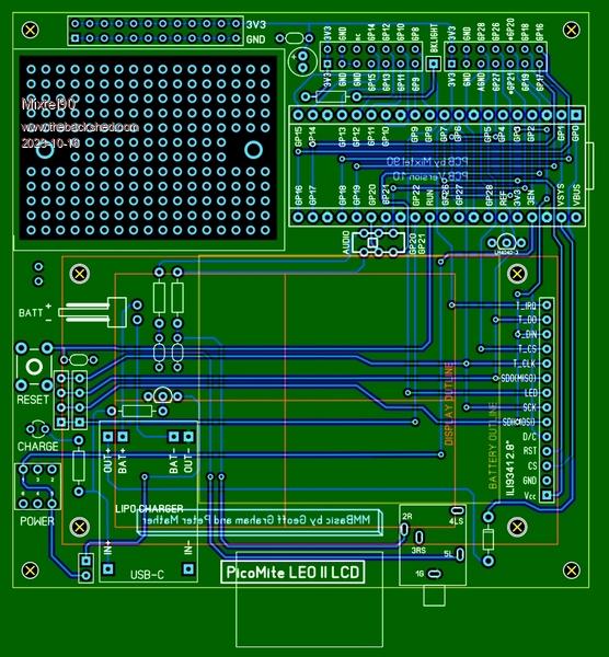 This has a bit of a history. Tom has commented that my PicoMite Backpack was one of the inspirations for his Game*Mite design. I was looking at the Game*Mite the other day (I've been programming on it) and wondered what it would be like as a multi-purpose testbed. Then I realised that, up until now, I haven't done anything quite like that. Stan has been looking at alternatives to PCBs and he uses the ILI9341 so I figured that would be a good approach so... This design is a right mongrel. :) It's designed around the 2.8" SPI version of the ILI9341. It may be possible to use the 3.2" version but I've not got the dimensions for that so don't hold me to it. It's heavily based on the Game*Mite, using identical GPn pins for the display, SD card and expansion port. One of the GND pins is now AGND. GP20 and GP21 can be switched between the IO port and stereo audio out (audio uses a simple single-stage filter. Probably OK for 35R headphones). The keypad GPn pins are now on a second 2x7 header with a similar layout. In theory you could plug some buttons into this and run the Game*Mite software. There is space for a LM4040 analogue voltage reference. A "sea of holes" area can be covered by a 170-pin breadboard, so the system can be either temporary or permanent. This is provided with a header carrying 3V3 and GND. You can fit a battery charger and LiPo battery, using USB-C as the charging port. While charging the PicoMite is switched off automatically. A link can override this. This system is not quite the same as the Game*Mite system. It's impossible to get a feed into the VBUS pin so battery, USB-C and micro USB can all be connected simultaneously if you really want to get confused. I'll post Gerbers if anyone is interested. Mick Zilog Inside! nascom.info for Nascom & Gemini Preliminary MMBasic docs & my PCB designs |