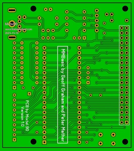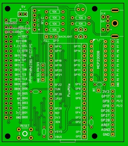 @ Philip & Louis Something like this? It's designed to fit behind the 4.3" display so is covered by the larger ones. Some sort of support might be needed for the free end. The only GPn pins not brought out directly are GP20 and GP21, which are used for the I2C interface. Mick Zilog Inside! nascom.info for Nascom & Gemini Preliminary MMBasic docs & my PCB designs |