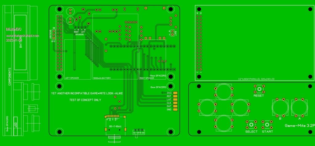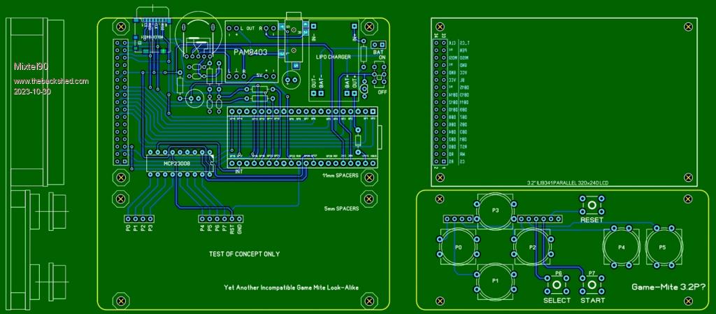 I've cheated horribly because the PicoMite hasn't enough GPIO so the buttons are on an I2C expander. Consequently this isn't Game*Mite compatible and I can't make it so. It's merely a concept to see what would fit where. I've no display so I can't get an exact thickness or anything. Treat it as a pretty picture. :)