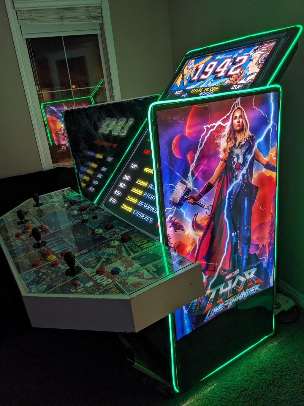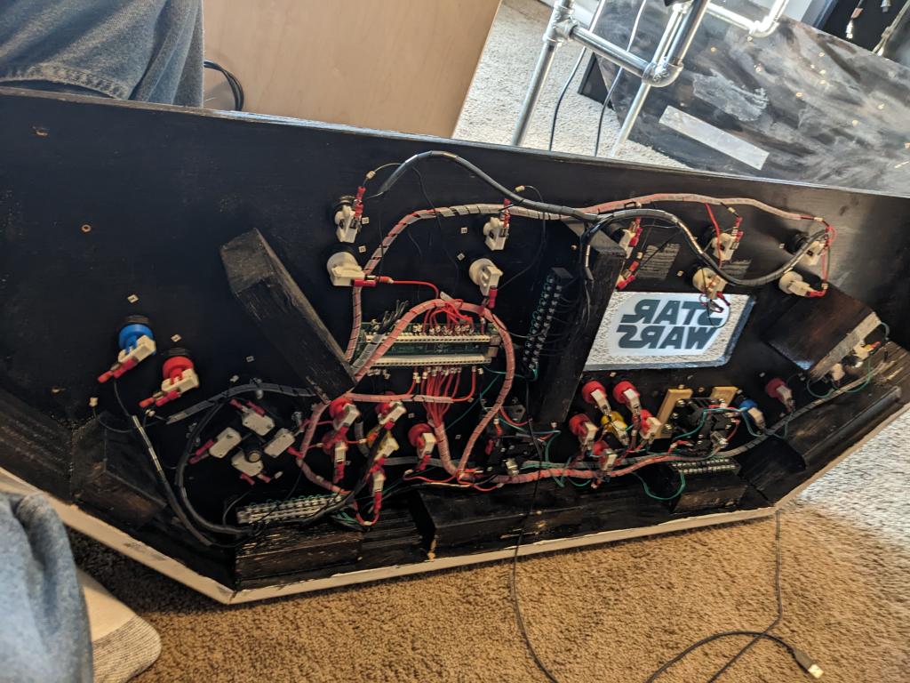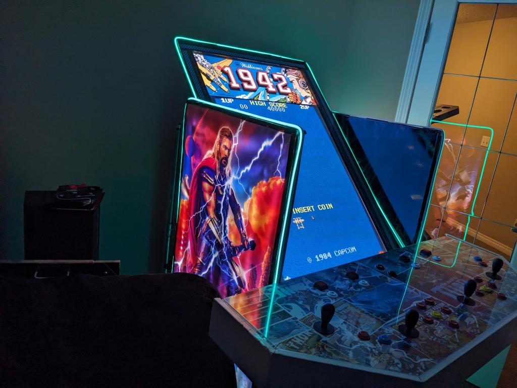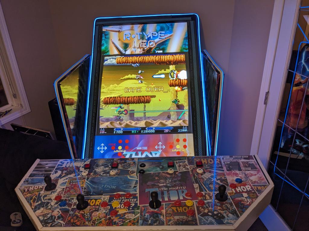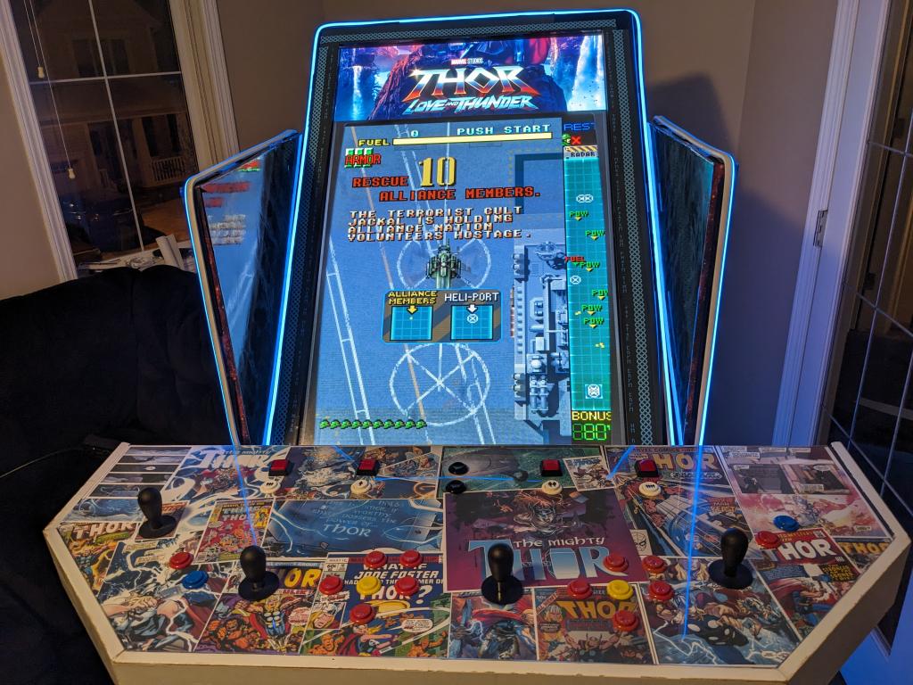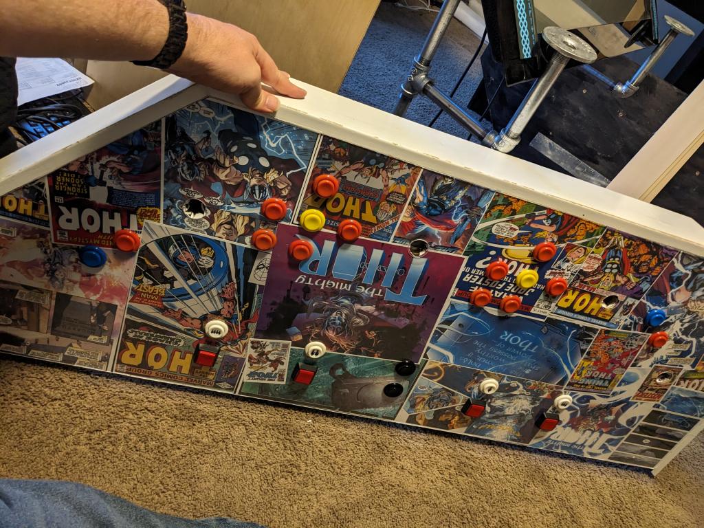 Having been left unsupervised for a week, I've been tinkering, and I thought you guys might appreciate it. As many of you know, I've always been a bit of an arcade buff, building cabinets and the like. I got the idea of using 1/2" steel pipe to make the frame of a cabinet - so that it would be light and rigid. I also re-used a really old (and heavy) 55" plasma TV that's been languishing in our basement. ![]() Then to make a couple of back lit side panels using extra bright LEDs. ![]() And then re-wiring an old control panel I built years ago. This has an Ultimarc I-PAC 4 keyboard encoder at the heart of it. It's a bit long in the tooth now, but still works great. Takes a bunch of digital inputs and converts them to USB keypresses. https://cdn.shopify.com/s/files/1/0008/4262/9179/files/I-PAC_4_Player_Card_Wiring_Diagram.pdf?v=1600300277 ![]() The old control cabinet was Star Wars themed - so I refreshed it with a Thor based theme by buying a bunch of Thor Comic PDF's online and printing out the frames that I wanted. ![]() Edited 2023-10-31 06:50 by PeteCotton |