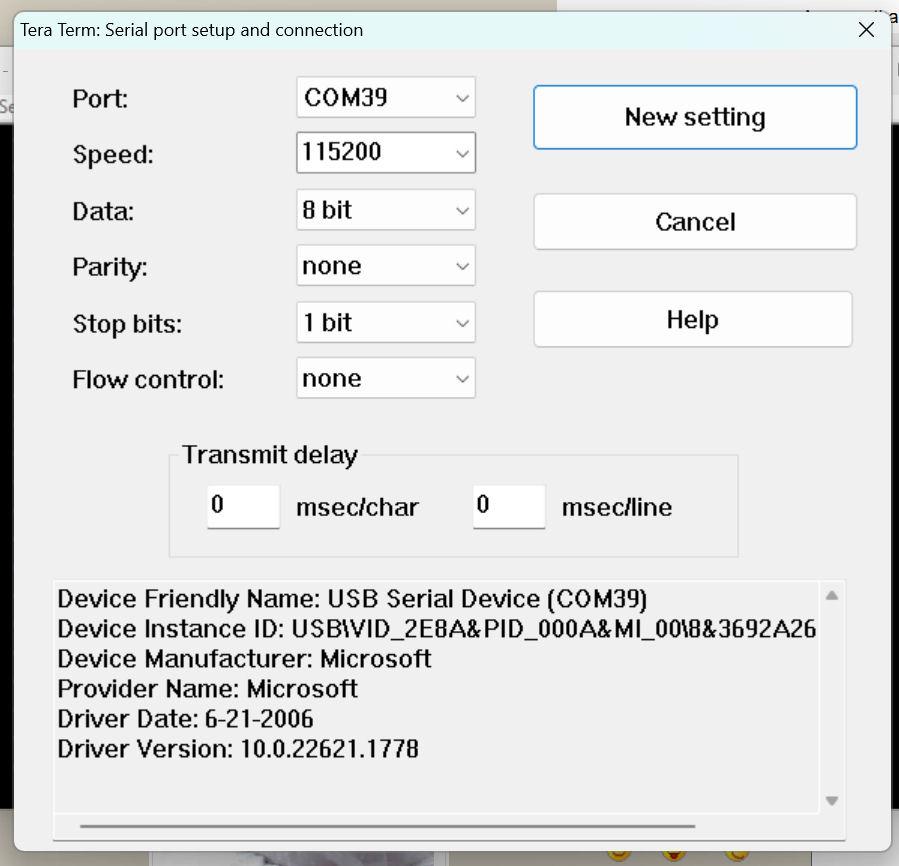 be sure to set hardware flow control to NONE. the pico also requires that DTR be ASSERTED. this has been an issue since the pico was fist released, and as far as i am aware has not yet been fixed in tinyusb. use google to search for: