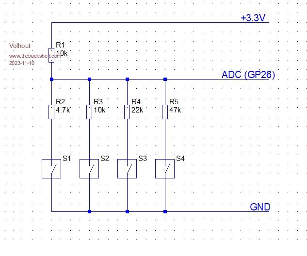 Hi Mick, GP26..28 are ADC channels Its is easy to connect multiple switches to 1 ADC pin, and if you use R-2R-4R-8R resistors you can even detect double presses. Volhout PicomiteVGA PETSCII ROBOTS |