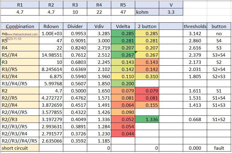 I think it is do-able to decode 4 keys with one ADC input. With following circuit. ![]() This will give you 80mV minimum resolution for 2 key press detect (change R1 to 4.7k). This is in the "2-button" column in the red fields (0.080 = 0.080 volt = 80 milivolt) Result from following analysis: And a small (not tested) MMBasic program to show how it works. You scan through the voltage levels in the array, and see where the ADC pin voltage crosses a threshold. 'key decode for ADC connected keys dim v(11)=(3.142,2.860,2.616,2.379,2.173,2.031,1.805,1.611,1.531,1.413,0.668,0) dim k$(11)length 5=("no","S4","S3","S3+S4","S2"."S2+S4","S2+S3","S1","S1+S4","S1+S3","S1+S2","fault") setpin gp26,adc do volt=pin(GP26) i=12 do i=i-1 loop while volt < v(i) print k$(i) pause 100 loop You can extend this of coarse to 5 or 6 swiches, but you may have to calibrate the ADC, and add averaging and noise filtering. Since (as you can see in the analysis) there will be very small steps you need to detect. The ADC resolution (4096 steps for 3.3V) has a 1mV resolution, so technically 6 buttons is possible. You may need precision resistors in non E96 values to get sufficient accuracy. Edited 2023-11-10 18:42 by Volhout PicomiteVGA PETSCII ROBOTS |