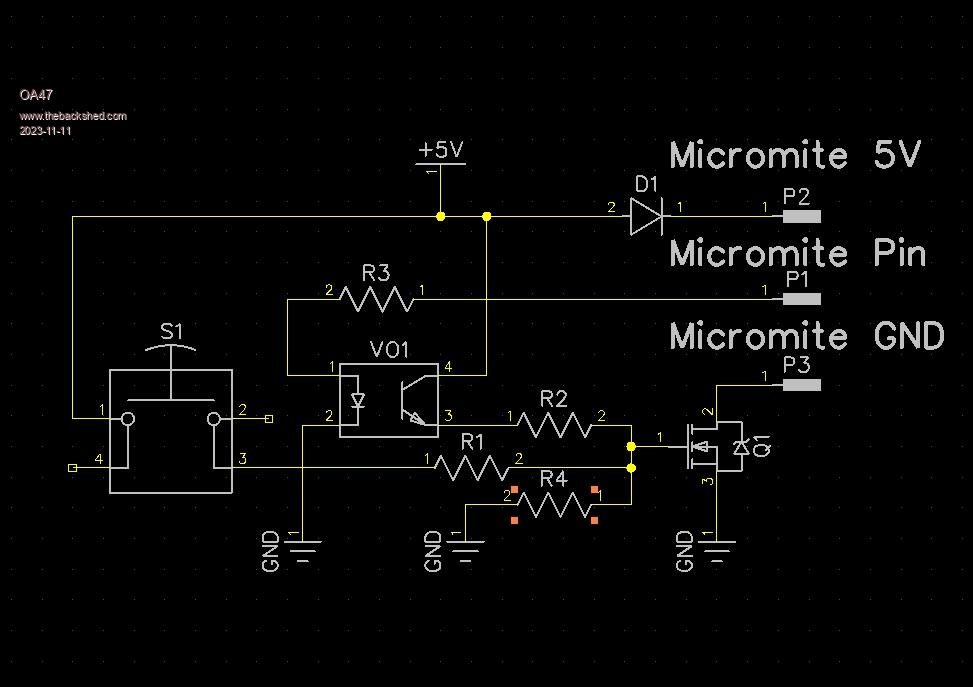 Hi OA47, When the FET is off, there flows a current from P2 to P1 through an unpowered microsite chip, and a 5V regulator that does not have ground reference. You have been lucky that it worked. Depending manufacturer and type of the voltage regulator, it might not work. if you connect the cathode of the opto led to P3 it should work. Volhout Edited 2023-11-11 18:59 by Volhout PicomiteVGA PETSCII ROBOTS |
