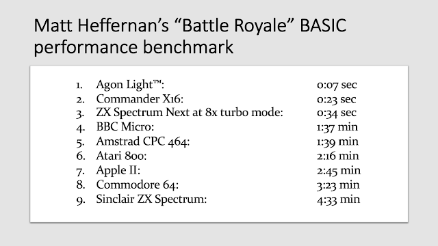 Well, I am a silly sausage. I've been looking at the how the CMM2 stacks up to the current competition. The Agon Light makes a big deal as to how fast it's basic is, and they publish a table on their website showing it compared to other computers using Matt Heffernan's Mandelbrot benchmark. ![]() So, I thought this would be an easy win, and punched the benchmark into my CMM2 - but try as I might, I couldn't get it running as fast as the Agon.... or so I thought. The CMM2 consistently runs the program in 136 milliseconds, how on earth was the Agon posting 70 millisecond times? Ah - this is where my stupidity comes in - that doesn't say 0.07 seconds - it says 0:07 seconds - i.e. it takes the Agon 7 seconds to draw the test. All is right with the world again. Even in Assembler, the Agon takes 0.7 seconds - see video below. So, the CMM2 BASIC is 5 times faster than the Agon Assembled version. https://www.youtube.com/watch?v=UxLk_X8VIK8 *This post is not meant to knock the Agon - it's an 8 bit machine running against a 480MHz ARM - and I think they've done a wonderful job with it. But if we are to put the CMM2 out there as one of the major front runners in the new retro scene - and a machine where you can program the game of your dreams without needing to drop into machine code - then we need to be able to prove that it's as fast as we say it is. |