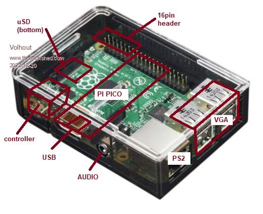 Now I look at the PI case, the RJ45 could become PS2. The quad USB could become VGA. If you SMD mount the pico, you could use one of the uHDMI holes for the pi's microUSB.