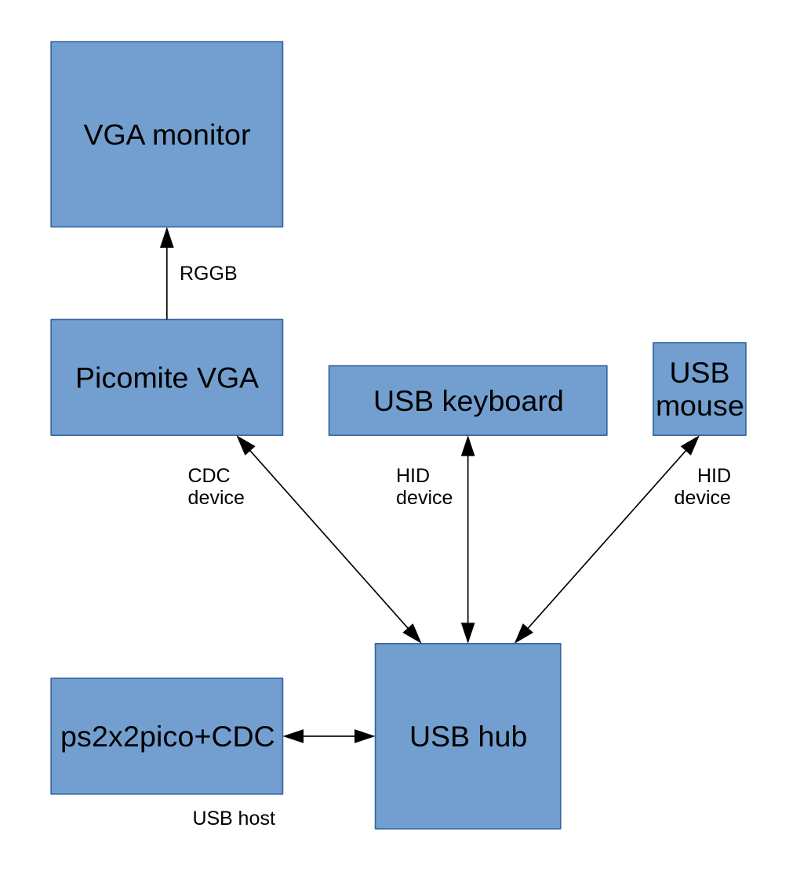 a further idea occurred... what if the ps2x2pico were extended to ps2x2pico+CDC? ie, add CDC device support to the ps2x2pico so that it could talk to: 1. a USB keyboard device, 2. a USB mouse device, 3. a USB CDC serial device. the USB CDC serial device would be a (more-or-less) stock-standard "picomite VGA". the ps2x2pico would, instead of providing 2x PS/2 output ports, translate keyboard and mouse data into VT escape sequences and send them straight back out to the attached CDC device (aka "picomite VGA"). the "picomite VGA" would then just need to: A. take input from it's USB port as if a terminal emulator were talking to it, B. send all output to it's the VGA port. correct me if i am wrong, but can a picomite VGA not already do this? cheers, rob :-) addendum: ![]() Edited 2023-12-24 00:19 by robert.rozee |