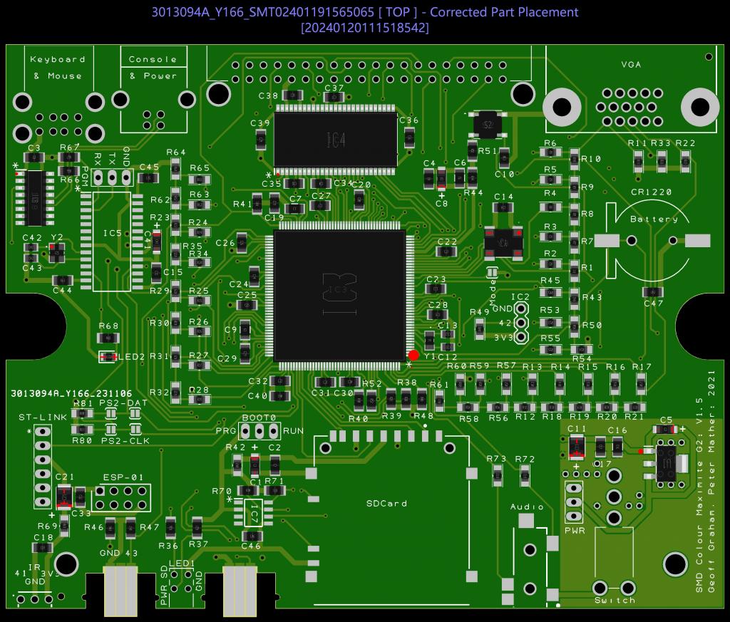 Just an update, in case anyone finds this useful. My completed Maximite 2 G2 PCBs have arrived. I've just completed soldering the additional non surface mount components. The board is working, I'm very happy to say. That confirms that I did the right thing in rotating the polarised components on the PCB vendors website. I just rotated the polarised components, so the polarity indicated on the component images on the PCB vendor website, matched the polarity indicators on the PCB silk screen layer, (also as viewed on the vendor website). It was the vast majority of the polarised components, that I needed to rotate, including the main big microcontroller chip. There were a few exceptions. I think there was one chip that didn't need rotating, and the regulator didn't, (there was no valid way to rotate the regulator anyway). I downloaded the firmware to the board, via its USB B socket, so I've been able to type into the Maximite, a couple of simple programs and run them successfully, which is great. The only thing is, that I have done the above, by accessing the Maximite via it's serial terminal. When I plug the Maximite into a VGA monitor, I'm getting no image on the monitor. I think i vaguely remember seeing something about why this might be on the forum or in a manual somewhere. I will investigate further. |