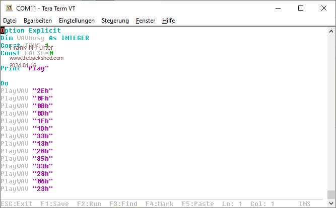 Hi, I have two problems. First the more important problem: My SPO256 emulation (https://www.thebackshed.com/forum/ViewTopic.php?FID=16&TID=15431#195775) only works a few times. Then I get this error here: [66] Play WAV "A:\SPO256Phonemes\"+wav$+".wav",IROUTINE Error : Not enough memory > Before that, the program worked endlessly! This is the current program: Option Explicit Dim WAVbusy As INTEGER Const TRUE=1 Const FALSE=0 Print "Play" Do PlayWAV "2Eh" PlayWAV "0Fh" PlayWAV "0Bh" PlayWAV "0Dh" PlayWAV "1Fh" PlayWAV "1Dh" PlayWAV "33h" PlayWAV "13h" PlayWAV "28h" PlayWAV "35h" PlayWAV "33h" PlayWAV "28h" PlayWAV "06h" PlayWAV "23h" Pause 1000 PlayWAV "1Bh" PlayWAV "07h" PlayWAV "2Dh" PlayWAV "35h" PlayWAV "03h" PlayWAV "02h" PlayWAV "0Dh" PlayWAV "1Fh" PlayWAV "03h" PlayWAV "02h" PlayWAV "12h" PlayWAV "13h" PlayWAV "03h" PlayWAV "02h" PlayWAV "3Fh" PlayWAV "1Ah" PlayWAV "0Dh" PlayWAV "29h" PlayWAV "03h" PlayWAV "02h" PlayWAV "25h" PlayWAV "07h" PlayWAV "0Dh" PlayWAV "1Dh" PlayWAV "03h" PlayWAV "02h" Pause 1000 'Loop 'Do PlayWAV "hh2" PlayWAV "aa" PlayWAV "ll" PlayWAV "ll" PlayWAV "ow" Pause 1000 Loop Sub PlayWAV wav$ WAVbusy=TRUE 'Play WAV "B:\SPO256Phonemes\"+wav$+".wav",IROUTINE Play WAV "A:\SPO256Phonemes\"+wav$+".wav",IROUTINE Do Loop While Wavbusy=TRUE End Sub Sub IROUTINE WAVbusy=FALSE End Sub (The corresponding WAVs are in the link above...) It doesn't matter whether I play the WAV from the internal drive or from the SD card. My second problem concerns the color display with Terra Term. I have inverted the color scheme because I can read better on the light background. ![]() So far this has not been a problem. In the editor, the font (instead of black) was ONLY displayed in a more illegible light gray with OPTION COLORCODE ON. With OPTION COLORCODE OFF, or when you left the editor, the font was crisp black again. Now, however, it is illegible light gray even with COLORCODE switched off and after exiting the editor. However, when restarting (before calling the editor), the font is black... ![]() This is what it looks like in the editor: ![]() This is what it looks like after leaving the editor: ![]() The WAV problem and the editor problem already existed with PicoMite_Beta V5.08.00b5, but I only noticed it in the last few days. With PicoMite MMBasic version 5.07.06b9 I had at least no problems... Oh yes, I use a RP2040 Geek with the following options: > Option List PicoMite MMBasic Version 5.08.00RC3 OPTION SYSTEM SPI GP10,GP11,GP28 OPTION FLASH SIZE 4194304 OPTION COLOURCODE ON OPTION HEARTBEAT OFF OPTION PICO OFF OPTION LCDPANEL ST7789_135, LANDSCAPE,GP8,GP12,GP9,GP25 OPTION SDCARD GP23, GP18, GP19, GP20 OPTION AUDIO GP2,GP3', ON PWM CHANNEL 1 > Frank |