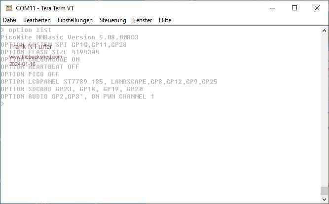 New problem found... It looks as if the default setting for the backlight is not applied after a restart: BACKLIGHT n [,DEFAULT] BACKLIGHT 2,2 The backlight setting works, but is back to maximum after a restart... (tested on a RP2040 Geek and OPTION LCDPANEL ST7789_135, LANDSCAPE,GP8,GP12,GP9,GP25) Frank |