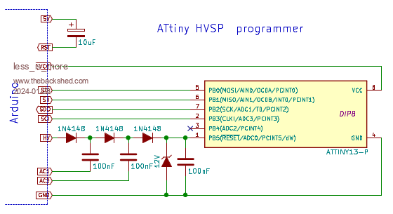 His circuit has been further simplified to only 3 signal diodes,and 3 caps. Using a nano board, the generated voltage is 11.75V which is sufficient to enter HVSP mode. To stay safe, a 12V zener was added.