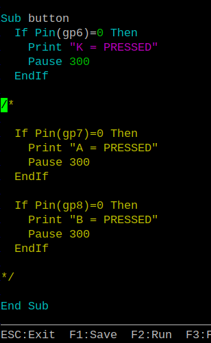 Hi Mick; Yes it will run without error if I individually comment each line. I just thought it would be nicer to comment out a bunch of lines with this new functionality. But now it's a case of understanding what the manual is saying in the event I have a larger project and want to mass comment. The sub routine is actually an interrupt handler for the buttons pushed. I probably should have mentioned that. Did not try the do loop and you can see why in the program I provided. I have an Arduino pinned hat with a joystick and 6 buttons. Too many wires in the way to test coding with just the joystick so I dug the joystick out of my Arduino kit and just wired it separately. ' Funduino Version 5 ' 3V switched on SetPin gp6,intl,button 'K SetPin gp7,intl,button 'A SetPin gp8,intl,button 'B SetPin gp26,ain SetPin gp27,ain 'Print "Funduino Joystick" Print "" Do Print Pin(gp26), Pin(gp27) Pause 300 Loop Sub button If Pin(gp6)=0 Then Print "K = PRESSED" Pause 300 EndIf /* If Pin(gp7)=0 Then Print "A = PRESSED" Pause 300 EndIf If Pin(gp8)=0 Then Print "B = PRESSED" Pause 300 EndIf */ End Sub BTW this is the original controller I was using. I got rid of the headers on top of the board. ![]() Thanks guys, Hans ... |