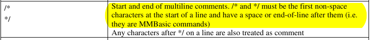 No, I think what you've done is correct. /* this is a multiline comment */ and you can use this line as well works correctly as a piece of stand-alone code. Mick Zilog Inside! nascom.info for Nascom & Gemini Preliminary MMBasic docs & my PCB designs |