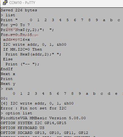 Phil99 and Lizby: I've done as you said.  I commented out the SetPin and I2C open calls.  Still doesn't work for me.  Error returned on the write.  I'm using the PicomiteVGA code, very latest. I also tried it on another Pico with Webmite software installed.  Tried it with the code you supplied. Setpin gp0, gp1, I2C returns illegal configuration.  I then used Option System I2C gp14, gp15.  System rebooted.  Tried same code except commented out the two first lines.  Same error on write as with the picomiteVGA code.
