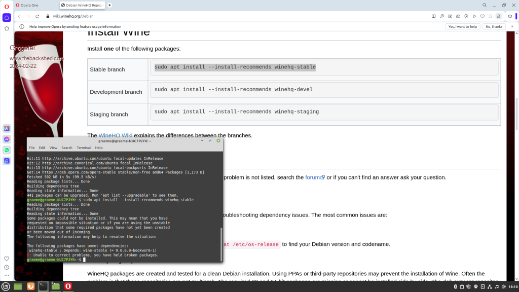 hi Grogster, as far as i can tell, version 9 of Wine is not supported by Linux Mint 21.3, see: https://askubuntu.com/questions/1504207/when-i-try-to-install-wine-on-linux-mint-21-3-it-says-an-error-more-info-on-er it looks like you need to instead install Wine version 8: https://wiki.winehq.org/Ubuntu "Ubuntu 22.04 (Jammy Jellyfish) Linux Mint 21.x sudo wget -NP /etc/apt/sources.list.d/ https://dl.winehq.org/wine-builds/ubuntu/dists/jammy/winehq-jammy.sources" as John said, Wine is an enormously complex piece of software, and the latest release (version 9) makes use of functionality that is only included in Ubuntu 23.xx, whereas Linux Mint 21.x is based on Ubuntu 22.04. cheers, rob :-) Edited 2024-02-22 22:40 by robert.rozee |