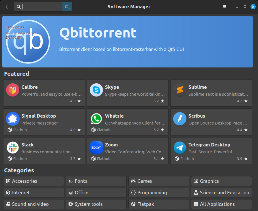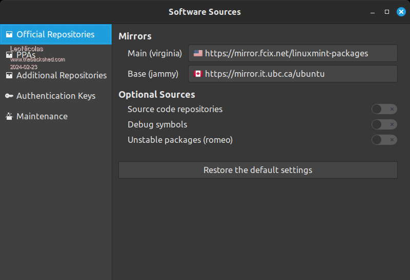 Hello I'm using Linux Mint 21.3 and Wine 9. Software in Linux is, in general, is installed using a package manager. Linux Mint is based on Ubuntu. Mint 21.3 is based on Ubuntu 22.04, which is based on Debian. To install Wine 9, you must use the Ubuntu 22.04 repository. https://wiki.winehq.org/Ubuntu Mint's package manager is APT, which uses repositories to fetch the available software list. The distro comes with APT configured with the distro repositories, which can be extended with new repositories. Each repository is signed, and to add new ones, you need to install its key on your computer. The repositories configuration files are stored in/etc/apt/sources.list.d You can use the UI to add and remove them as well. ![]() ![]() I like to use the command line to add new repositories, install software, and update the system. These are the basics: sudo apt update => Updates the local software list fetching the repositories list sudo apt install [package name] => Install the package sudo apt search [text] => Searches the repositories sudo apt upgrade => Updates the installed software (it's necessary to run sudo apt update before this command) sudo apt remove [package name] => Uninstall the software sudo apt autoremove => Delete installed dependencies no longer used sudo apt autoclean => Delete cached packages Edited 2024-02-23 01:45 by LeoNicolas |