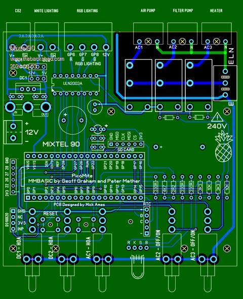 This is my current project between other things. :) It's a board (designed to fit a CMM2 case) that can be used for general purpose control. 2 DC outputs with ON-OFF-AUTO switches (selectable for 5V or 12V) -- (intended for white lighting and CO2 dosing solenoid 3 DC outputs -- (intended for PWM LED lighting) 1 AC mains relay output with ON-OFF-AUTO switching -- (intended for airstone pump) 2 AC mains relay outputs with OFF-ON switches and a crude form of relay coil monitoring -- (intended for filter pump and heater) 1 input for DS18B20 temperature sensor Socket for RTC Socket for SDcard reader Audio buzzer RGB indicator LED on front panel The idea is that it gets rid of a lot of 13A plugs & sockets, giving easy control of things (like shutting off the filter pump for cleaning) without bothering about wet hands. All switching is at 3.3V or 12V and all the toggles are connected to mains earth. I couldn't find small mains outlet connectors so I settled for 3.81 pitch pluggable terminals as these are not easy to touch. With hindsight I should have put links on the PCB to disable the relay for any unused mains output, but never mind. The plugs for the mains sockets are screwless types as the wire exits from the back. A bit of heatshrink sleeve should make them completely touch-proof, if a bit lacking in cable retention! As you can see, this could be used for all sorts of things where you just want a bit of a control system. It wouldn't take much to modify the design if you needed auto control of the two switched mains relays, but I deliberately wanted them safe. The tank can be run even without the Pico if necessary. Using a Pico W in this would allow me to update the program over Telnet, so no access is needed to the USB connector once up and running. That's one less hole in the box. The mains connections are reduced from: modified 6-way extension block hard-wired 2-pole timer two 2-way mains adapters plugs for: heater, filter pump, airstone pump, CO2 solenoid, RGB light, white light, work light, standby water heater to standard 4-way extension block plugs for: 12V PSU, mains supply, work light, standby water heater Mick Zilog Inside! nascom.info for Nascom & Gemini Preliminary MMBasic docs & my PCB designs |