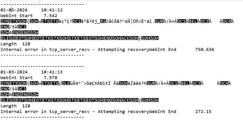 Hello John, in a "normal home environment" behind a router without open ports (e.g. FritzBox) there should be no such wild telegrams. Basically an html request should consist of readable ASCII characters. I have tried whether the WEB SERVER reacts to a ping. The ping response from the WEB Mite comes back, but my WEB SERVER interrupt gets nothing from it. Try using something like Wireshark to determine the IP address of the request. Show your OPTION LIST. What does your WEB CONNECT look like. Good luck with the further analysis. Ossi |