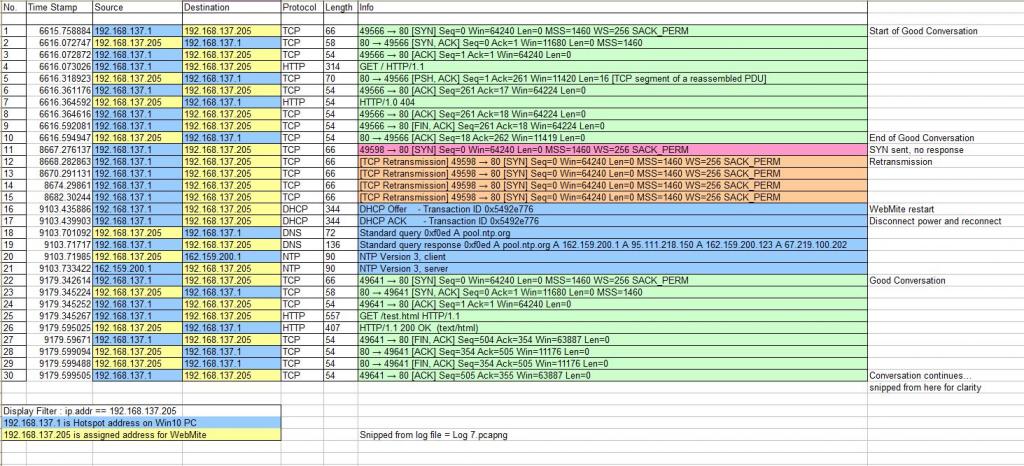 Morning all Here's the latest of my investigations for my problem (It's been a while but I've been a bit bust lately) Here's the only part of the WireShark logs that I can guarantee is the 'fault', because I was watching the WS screen scrolling at the exact time - so I know I got a good capture. This is a screen grab from an Excel file of the log, because I could highlight various parts of it to (hopefully) make a little more sense to me... Down to line 10, it was a good conversation. On line 11, a SYN was sent, but not answered - so it seems the handshaking was never completed (SYN : SYN,ACK : ACK), with 4 more tried attempts before I manually removed power and restarted. Here's the console print to MMCC at that moment Interestingly, the WMite watchdog didn't fire and the heartbeat continued to flash. For some reason, that seems to be the usual case running from a Hot Spot (that's what I've noticed, anyway) I'm still at a loss to why it's happening - it 'seems' the WebMite is missing the interrupt and I thought this morning that maybe the 1-second timer tick is being served when a web interrupt arrives. Is that possible? John |