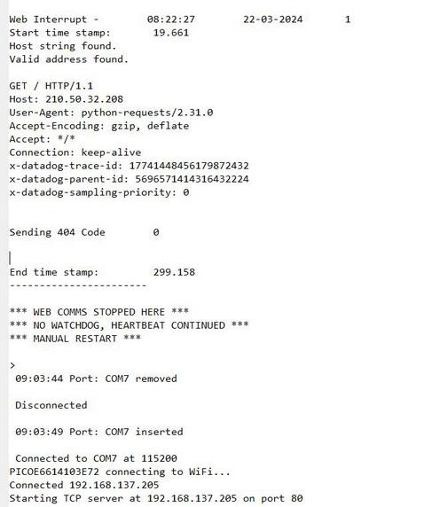 Thanks Jim, appreciate you taking a look and glad to hear I'm not quite going crazy yet... It seems like a lot of 'noise' for something that's normal, but as I say, I've no real idea on WWW protocols, so there were a few guesses on my part. There's probably a few filter words that could be used ("GET /", as you say) but I selected "HOST" because I also Tx/Rx from a VB program for changing code parameters, so I wanted to keep GET, POST (etc, etc) as reserved words and not muddy the waters with HTML code within VB. It was quick and easy to append the TxData string Private Sub Winsock1_Connect() Dim tmp As Variant tmp = "Host: " + NodeData(NodeNum).Address + vbCrLf Winsock1.SendData tmp + TxData End Sub In the VB code through WinSock It would be interesting to see what you can come up during your tests; I look forward to your results ![]() John |
