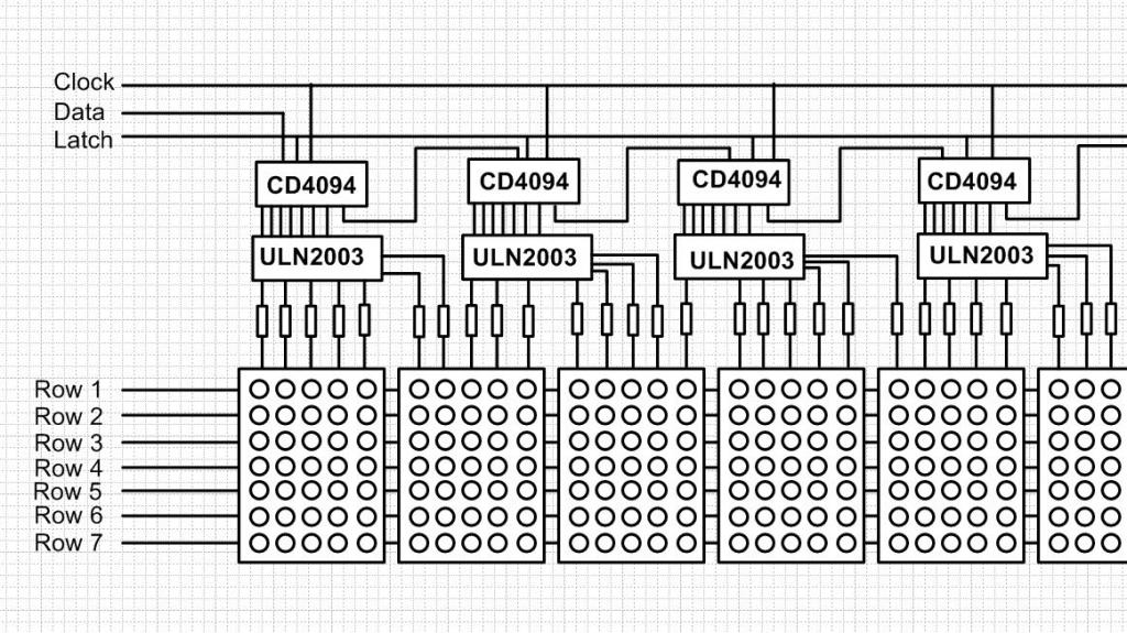 You might want to experiment with chucking data out a SPI port. ================ Drive all rows low (I think.) Send row 1 data out SPI Latch data to CD4094 Drive row 1 high - high current so need a high-side equivalent to the ULN2003 Send row 2 data Drive all rows low Latch data Drive row 2 high Send row 3 etc ================= The key is you can send the next row of data while the previous is being displayed. Visit Vegipete's *Mite Library for cool programs. |